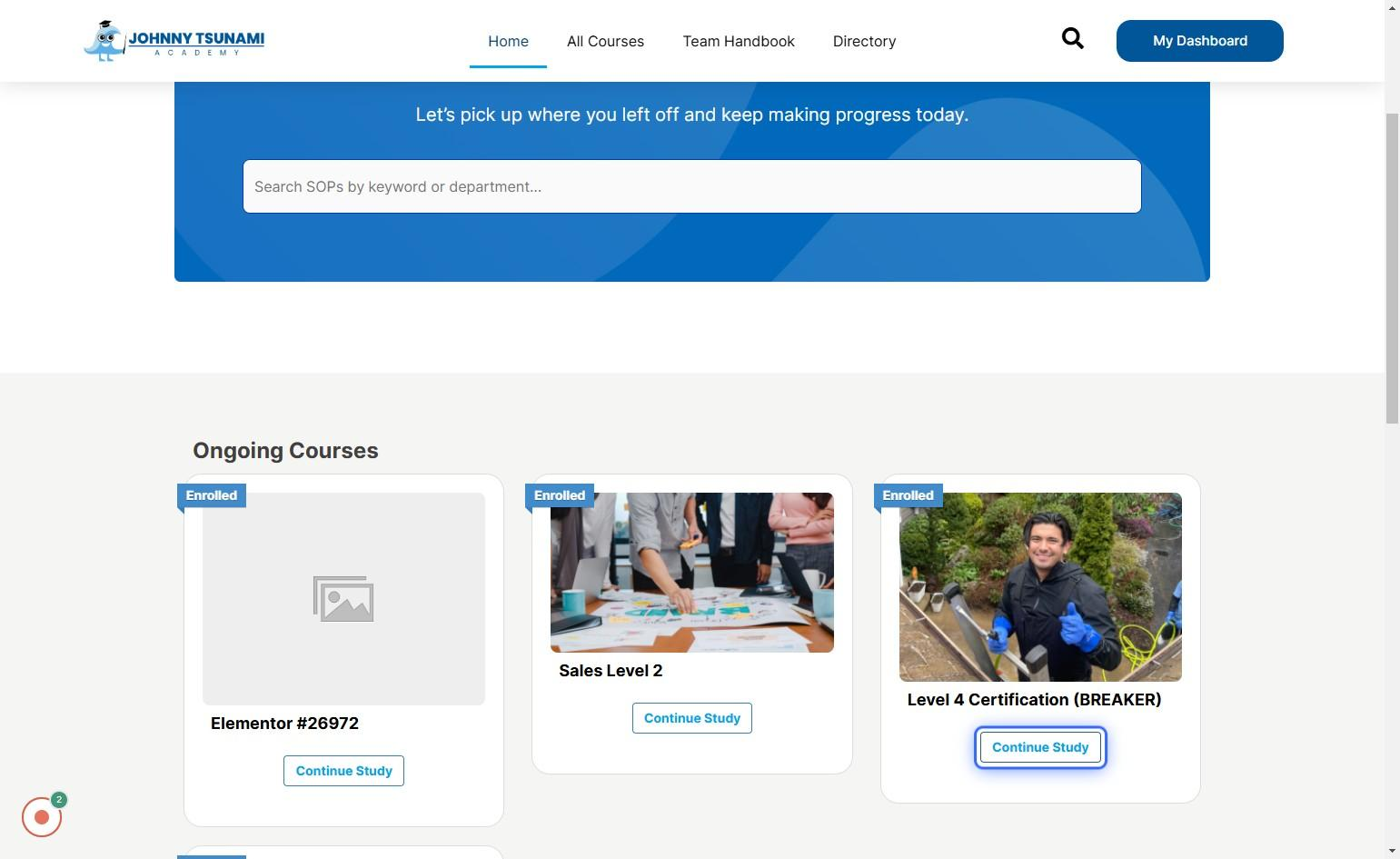 To continue studying the course, you need to click the ‘Continue Study’ button, which will take you to the course page.